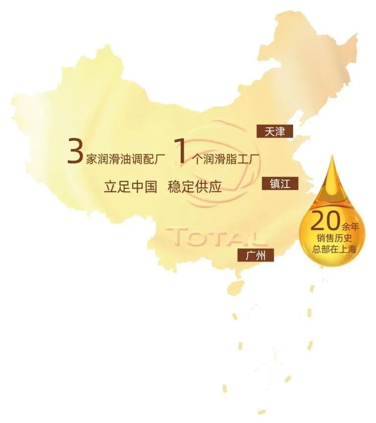 道达尔润滑油在中国拥有三家润滑油调配厂及一个润滑脂工厂,分别坐落于天津、广州和镇江。工厂设有码头、油罐、加工、仓储、办公等功能区,拥有世界先进水平的调配、灌装、包装、检验、测量和试验设备。同时拥有多套电脑控制全自动调和系统,多条自动化包装线以及配有世界先进的测试仪器的实验室,高度实现生产自动化。
